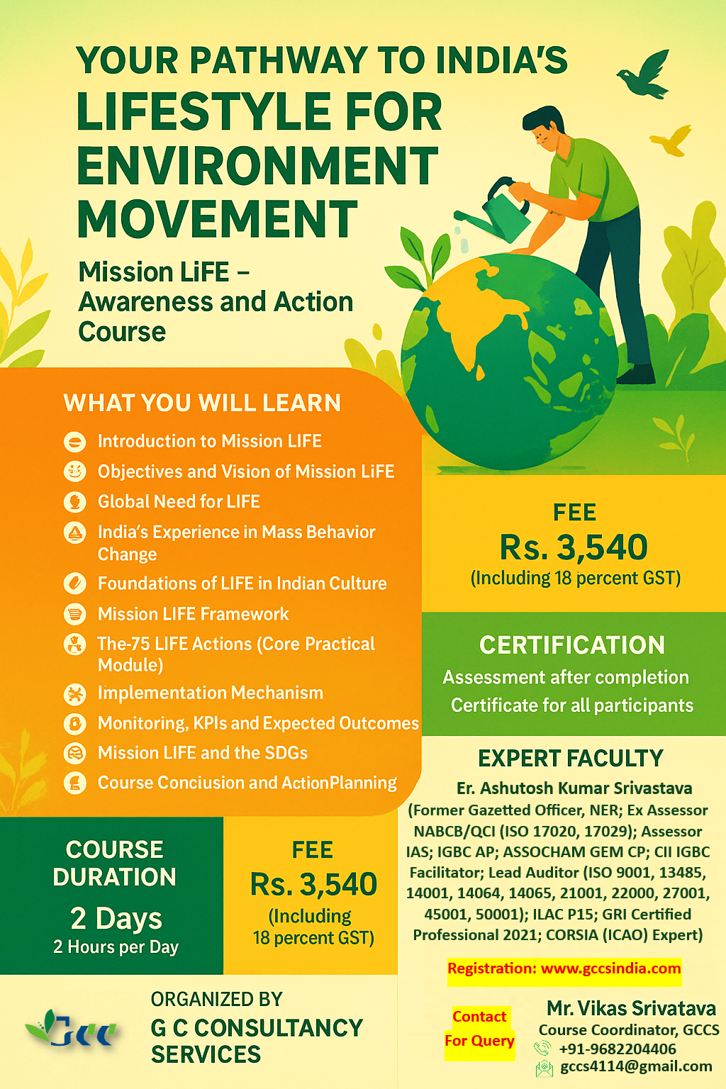 View | 5 | Mission LiFE – Awareness and Action Course | 02 Days | ₹ 3540 | Mission LiFE – Awareness and Action CourseDiscover how to live sustainably with our 2-day / 2 hours-per-day training on the Mission LiFE (Lifestyle for Environment) initiative. This course is designed for individuals, educators and community leaders who want to drive real-world behaviour change. What you’ll learn: