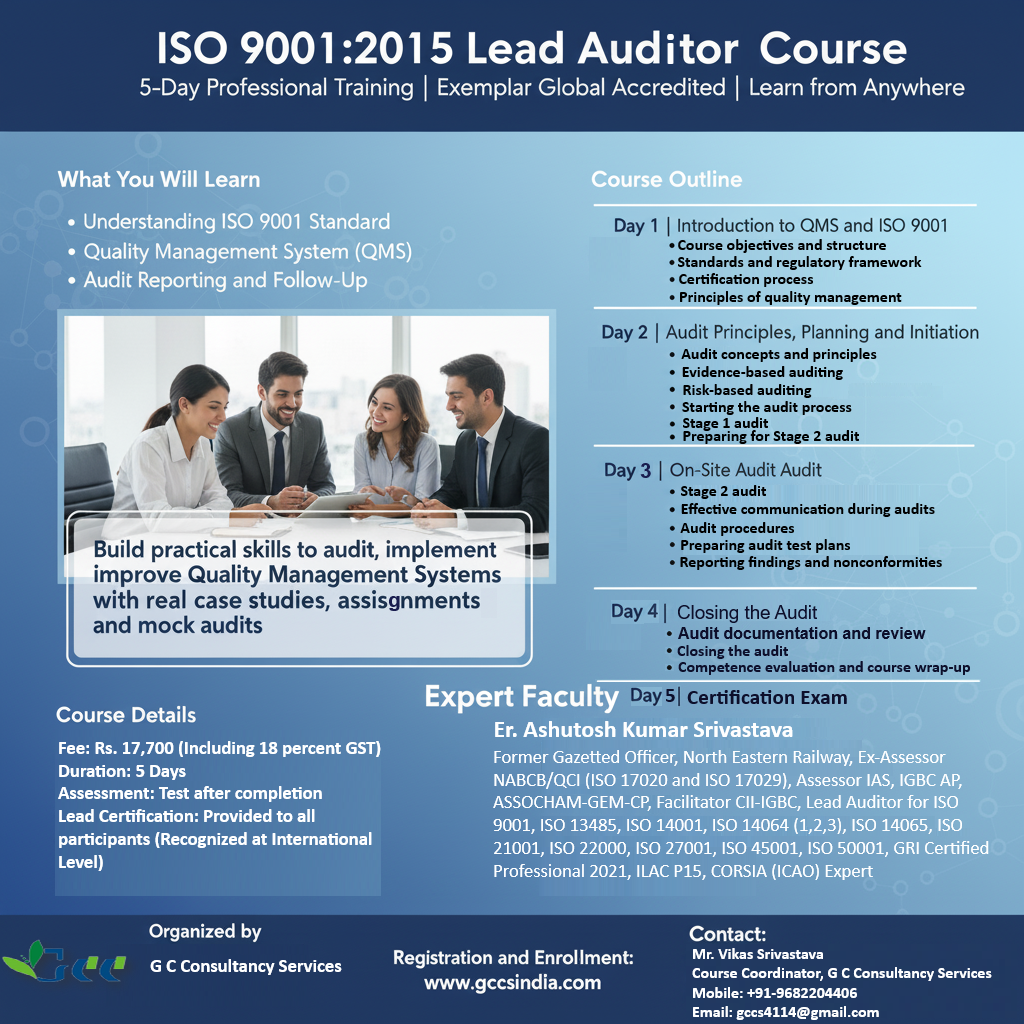 View | 4 | ISO 9001:2015 (Quality Management System) Lead Auditor Certification Course | 05 Days | ₹ 17700 | Become an Exemplar Global Accredited ISO 9001:2015 Lead AuditorMaster Quality Management Systems with Our 5-Day Professional Online TrainingElevate your professional credentials and become a certified expert in quality management. Our intensive 5-Day ISO 9001:2015 Lead Auditor Course is a comprehensive, Exemplar Global accredited program designed for professionals seeking to master the principles and practices of auditing Quality Management Systems (QMS). This course is delivered by G C Consultancy Services and provides the deep technical knowledge and practical skills to plan, conduct, report, and follow up on a QMS audit. Through real-world case studies, practical assignments, and mock audits, you will gain the confidence to lead audit teams and drive continuous improvement within any organization. Why Choose This ISO 9001 Lead Auditor Training?