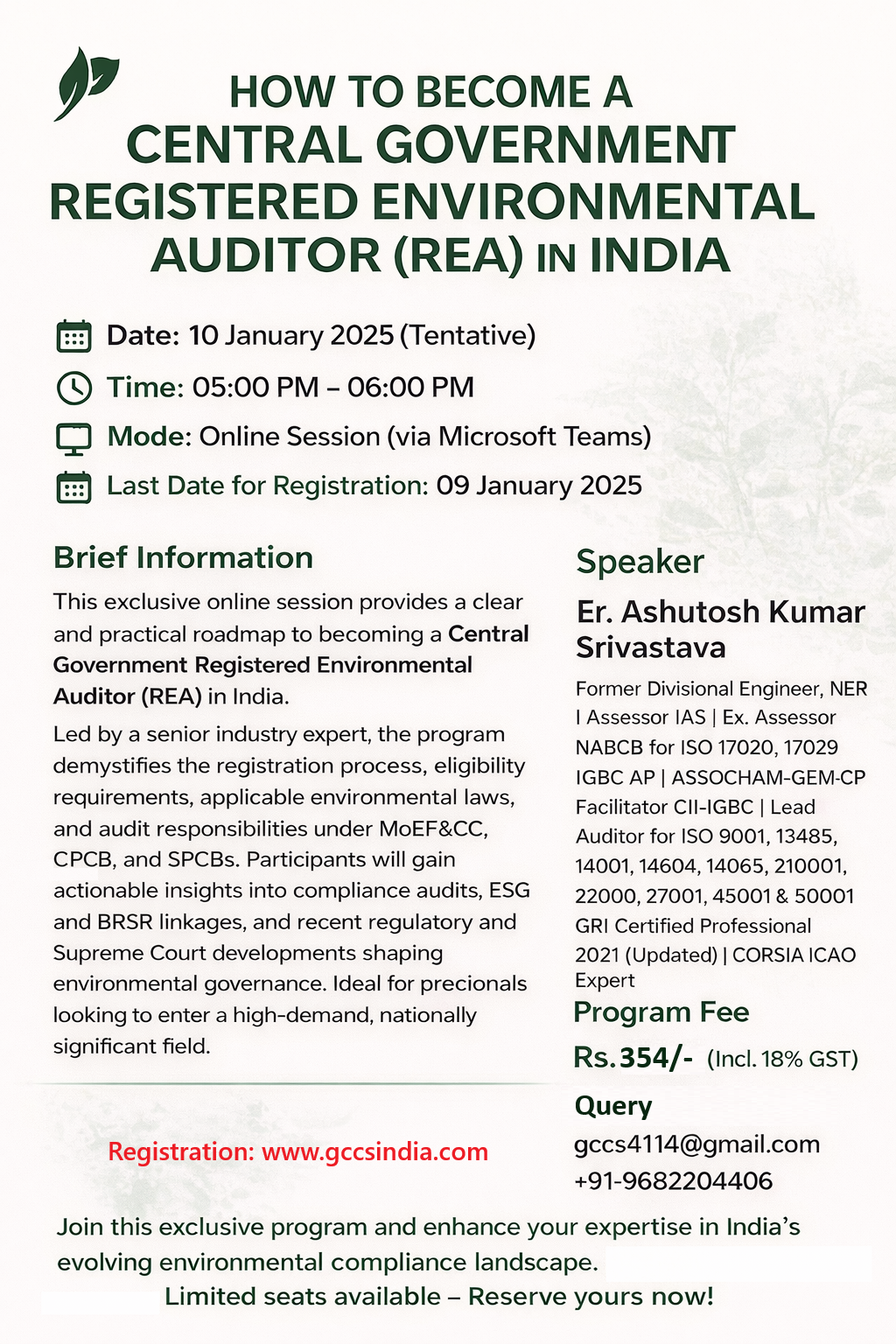 The orientation aims to provide structured and practical insights into each of these areas, ensuring participants gain a clear understanding of their relevance within the framework of the Environmental Audit Rules, 2025. Registration Email: gccs4114@gmail.com Phone: +91-9682204406 Website: www.gccsindia.com |