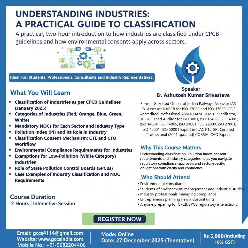 View | 2 | Understanding Industries: A Practical Guide to Classification | 2 Hours | ₹ 5900 | Understanding Industries: A Practical Guide to ClassificationGet a clear, practical understanding of how industries are classified under the latest CPCB 2025 guidelines. This two-hour online session covers industry categories, Pollution Index (PI), mandatory NOCs, CTE/CTO consent processes and key compliance requirements. Ideal for consultants, industry professionals, entrepreneurs and students involved in environmental approvals or regulatory work. Key Takeaways: Course Duration: 2 Hours (Online) |