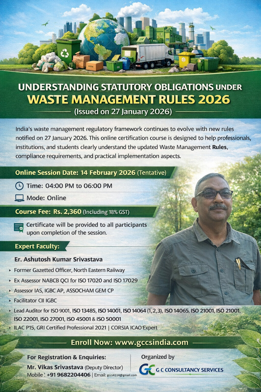 | 1 | Understanding Statutory Obligations Under Waste Management Rules 2026 | 02 Hours | ₹ 2360 | Stay compliant with India’s latest environmental regulations through this focused online certification course on the Waste Management Rules 2026, notified in January 2026. The program is designed for professionals, industries, consultants, institutions, and students who need a clear and practical understanding of statutory waste management obligations under Indian law. This course explains the updated Waste Management Rules, including duties of waste generators, bulk waste producers, industries, healthcare and educational institutions, and local authorities. It also covers compliance expectations during inspections, audits, consent conditions, and environmental reporting, making it especially relevant for ESG compliance, ISO audits, and regulatory submissions. The session is conducted online by a senior environmental professional with extensive experience in regulatory compliance, ISO standards, and third-party audits. Emphasis is placed on practical interpretation of rules, real compliance challenges, and implementation clarity, rather than theory or foreign frameworks. Participants will receive a certificate of completion, making this course valuable for environmental professionals, compliance officers, sustainability teams, auditors, and consultants working within the Indian regulatory system. The regulatory framework discussed in this course is based on notifications issued by the Ministry of Environment, Forest and Climate Change (MoEFCC), Government of India, which is the statutory authority for waste management rules in India. |