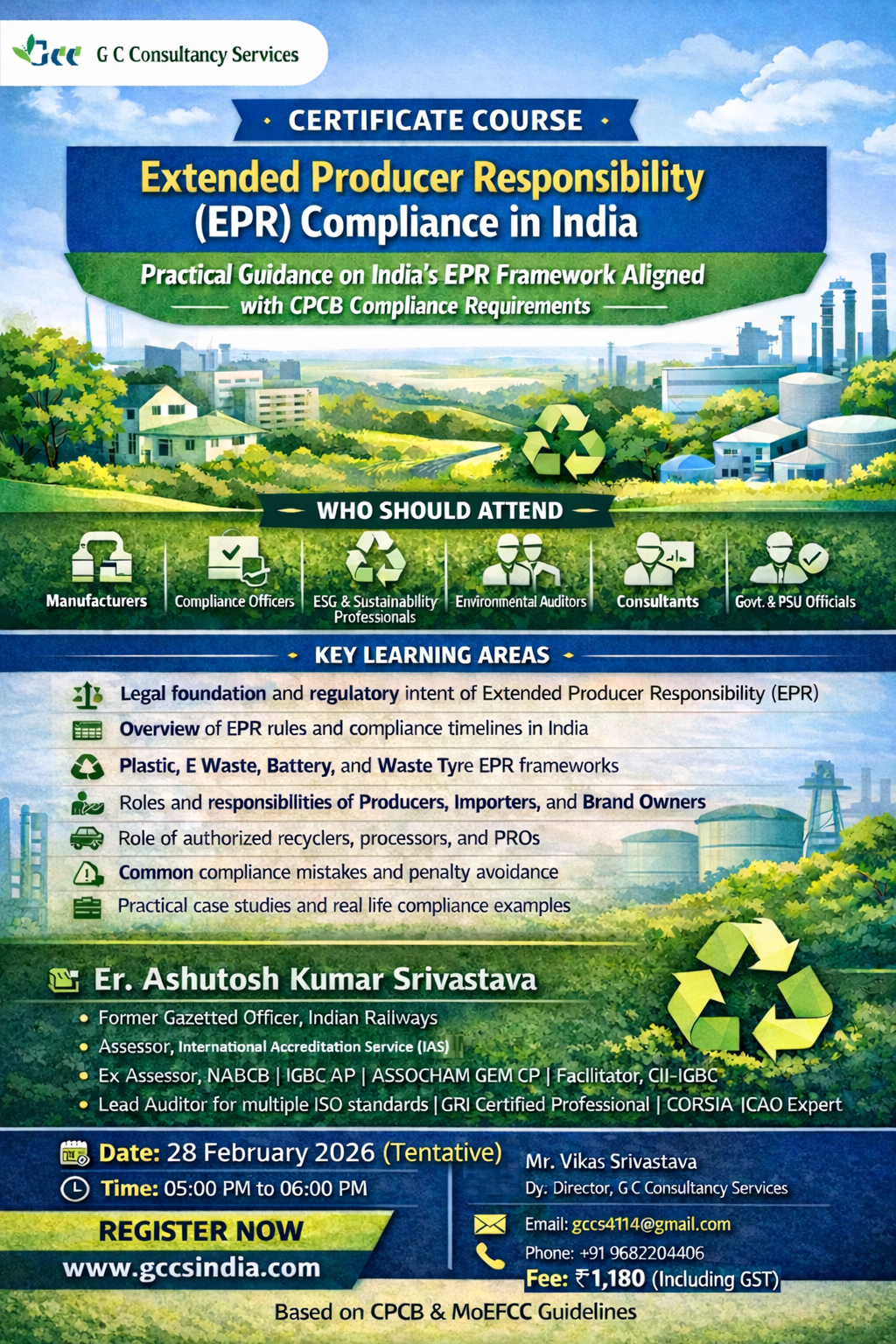 View | 2 | Extended Producer Responsibility | 1 Hour | ₹ 1180 | Certificate Course on Extended Producer Responsibility (EPR) Compliance in IndiaThis certificate course provides practical guidance on Extended Producer Responsibility (EPR) compliance in India, in line with the latest guidelines issued by the Central Pollution Control Board and the Ministry of Environment, Forest and Climate Change. The programme explains India’s EPR framework for Plastic Waste, E Waste, Battery Waste, and Waste Tyres, covering legal obligations, compliance timelines, roles of producers, importers, brand owners, recyclers, and Producer Responsibility Organisations. It also highlights common compliance gaps and practical approaches to avoid penalties. The course is designed for manufacturers, compliance officers, ESG and sustainability professionals, environmental auditors, consultants, and government or PSU officials seeking clear, practical understanding of EPR requirements. Date: 28 February 2026 |