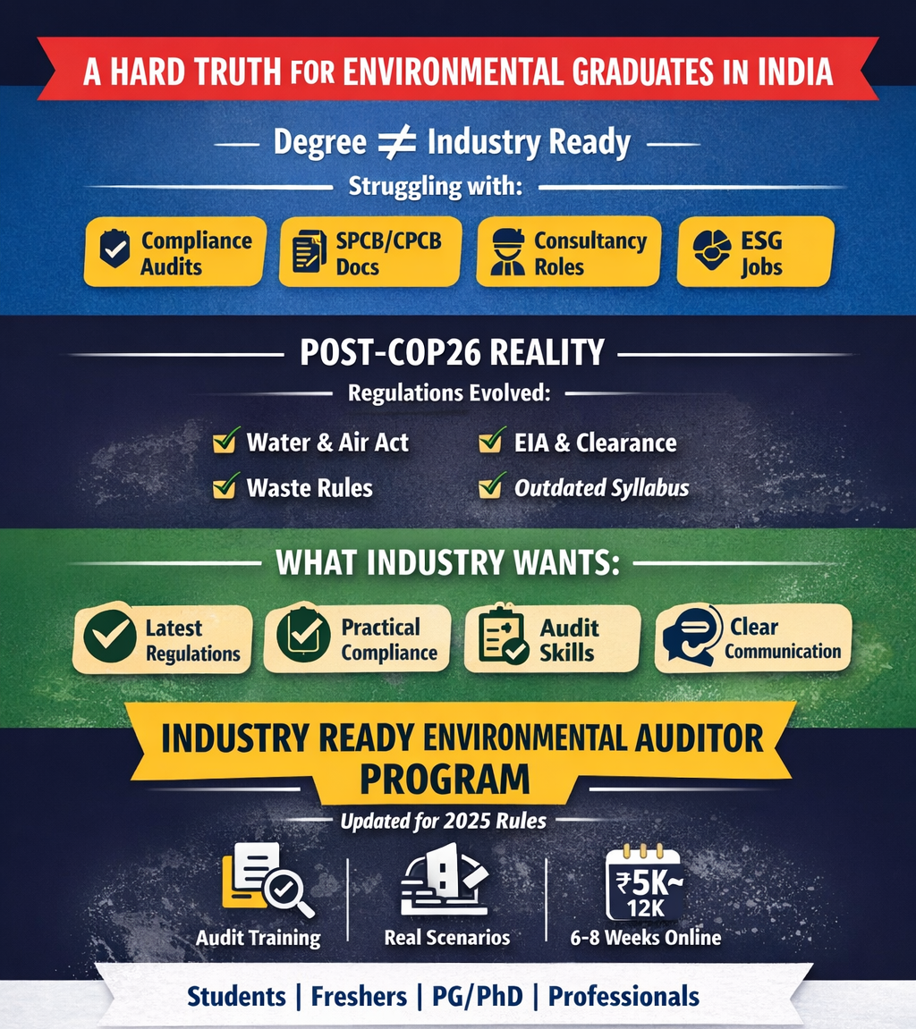 View | 2 | Industry Ready Environmental Auditor Program | 06 Weeks | ₹ 10000 | Industry Ready Environmental Auditor Program (2026 Batch) Struggling with SPCB/CPCB compliance, audits, or ESG roles? This 6-week practical program is designed to make you industry-ready.