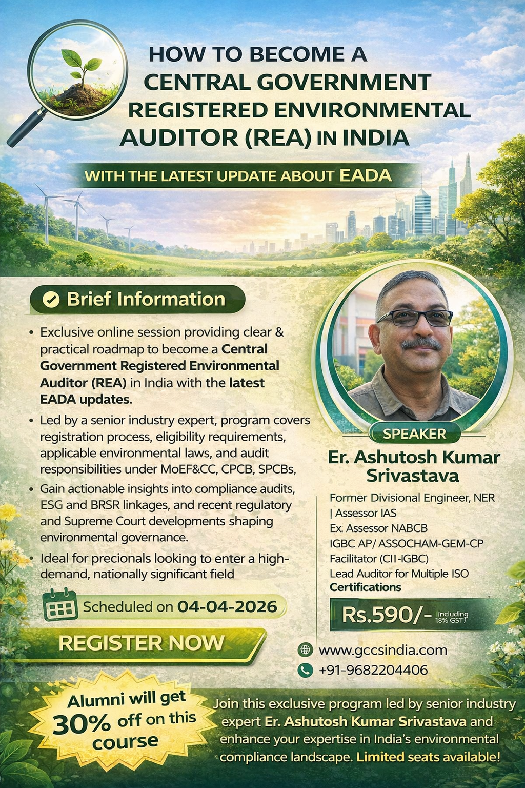 | 1 | Pathway to Become Central Government Authorized Auditor | 01:30 Hours | ₹ 590 | This course provides a practical and structured roadmap for professionals aspiring to become a Central Government Registered Environmental Auditor (REA) in India. It covers the latest updates on EADA along with key environmental laws, compliance frameworks, and audit procedures applicable under MoEF&CC, CPCB, and SPCBs. Participants will gain clear understanding of eligibility criteria, registration process, real-world audit practices, ESG and BRSR linkages, and recent regulatory developments shaping environmental governance in India. Designed and delivered by an experienced industry expert, this program is ideal for engineers, environmental professionals, and consultants aiming to build a career in environmental compliance and auditing. Duration: 01:30 Hour (04:30 PM to 06:00 PM) Limited seats available – Reserve yours now! |