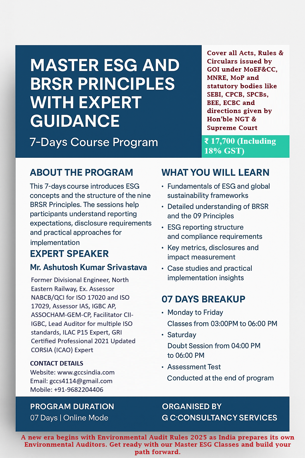 View | 4 | Master ESG and BRSR Principles with Expert Guidance | 07 Days | ₹ 17700 | These 7-days ESG and BRSR Master Program is designed to help professionals understand how sustainability, regulatory compliance and modern reporting frameworks are shaping the future of Indian businesses. The course offers a structured introduction to ESG principles, the nine BRSR Principles and the practical skills needed to interpret, implement and report ESG performance with confidence. Led by industry expert Mr. Ashutosh Kumar Srivastava, the program blends foundational knowledge with real-world examples, covering key Acts, Rules and Circulars issued by government ministries and statutory bodies. Participants gain clarity on how ESG expectations are evolving in India, especially as the country prepares for its own Environmental Auditors under the Environmental Audit Rules 2025. By the end of the course, learners are equipped with the understanding required to support sustainability reporting, compliance, audits and organisational ESG integration. |