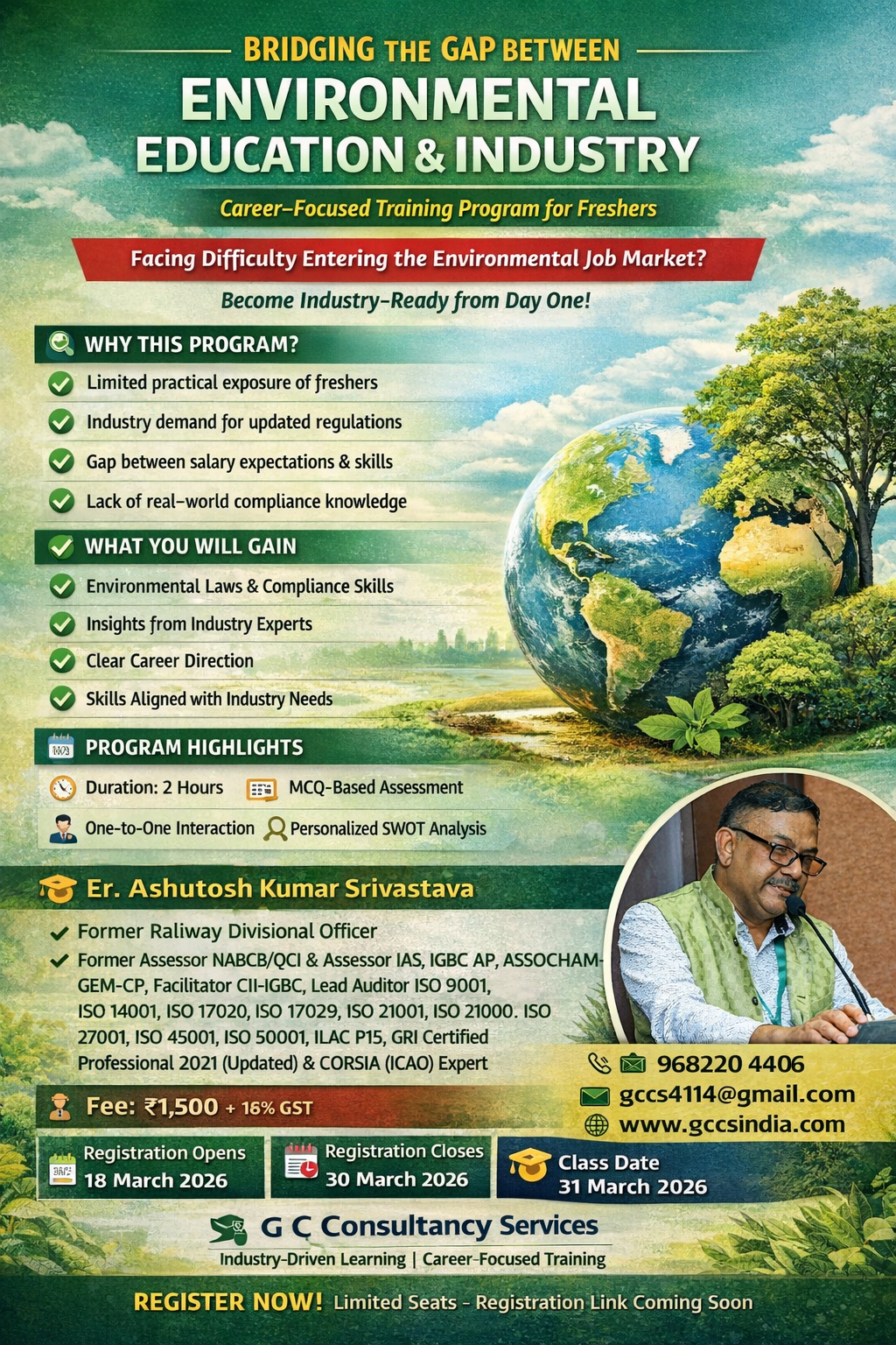View | 3 | Bridging the Gap Between Environmental Education & Industry | 02 Hours | ₹ 1770 | This career-focused training program is designed to help freshers and students transition smoothly from academic learning to real-world environmental industry requirements. The course addresses key skill gaps by focusing on practical knowledge, regulatory compliance, and current industry expectations. Participants will gain insights into environmental laws, compliance frameworks, and career opportunities through expert guidance and interactive sessions. The program also includes assessment-based learning and personalized SWOT analysis to help individuals understand their strengths and improve their employability. With direct interaction with industry experts and a strong focus on practical application, this program prepares participants to become confident, industry-ready professionals. Duration: 2 Hours |